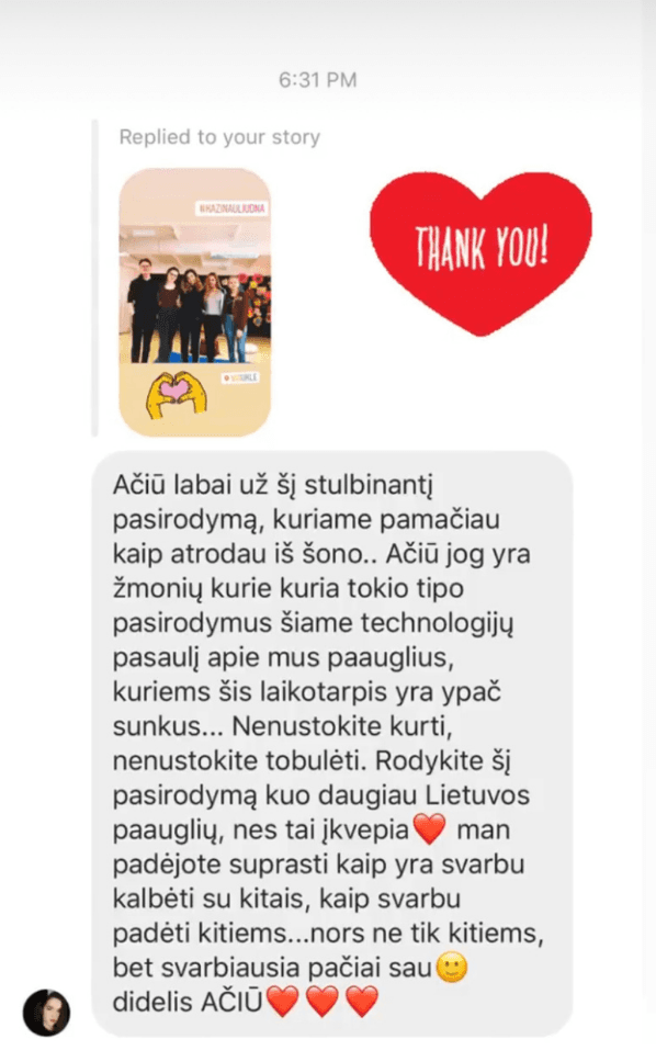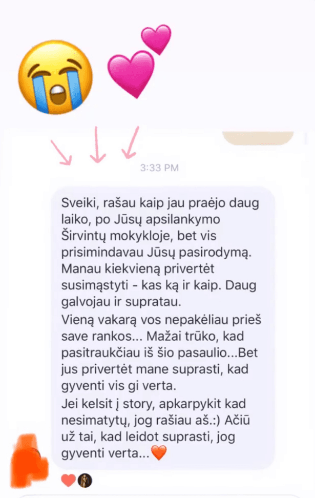 „Manau, kiekvieną privertėt susimąstyti − kas, ką ir kaip. Daug galvojau ir supratau. Vieną vakarą vos nepakėliau prieš save rankos… Mažai trūko, kad pasitraukčiau iš šio pasaulio… Bet jūs privertėt mane suprasti, kad gyventi visgi verta. Ačiū už tai, kad leidot suprasti, jog gyventi verta.“